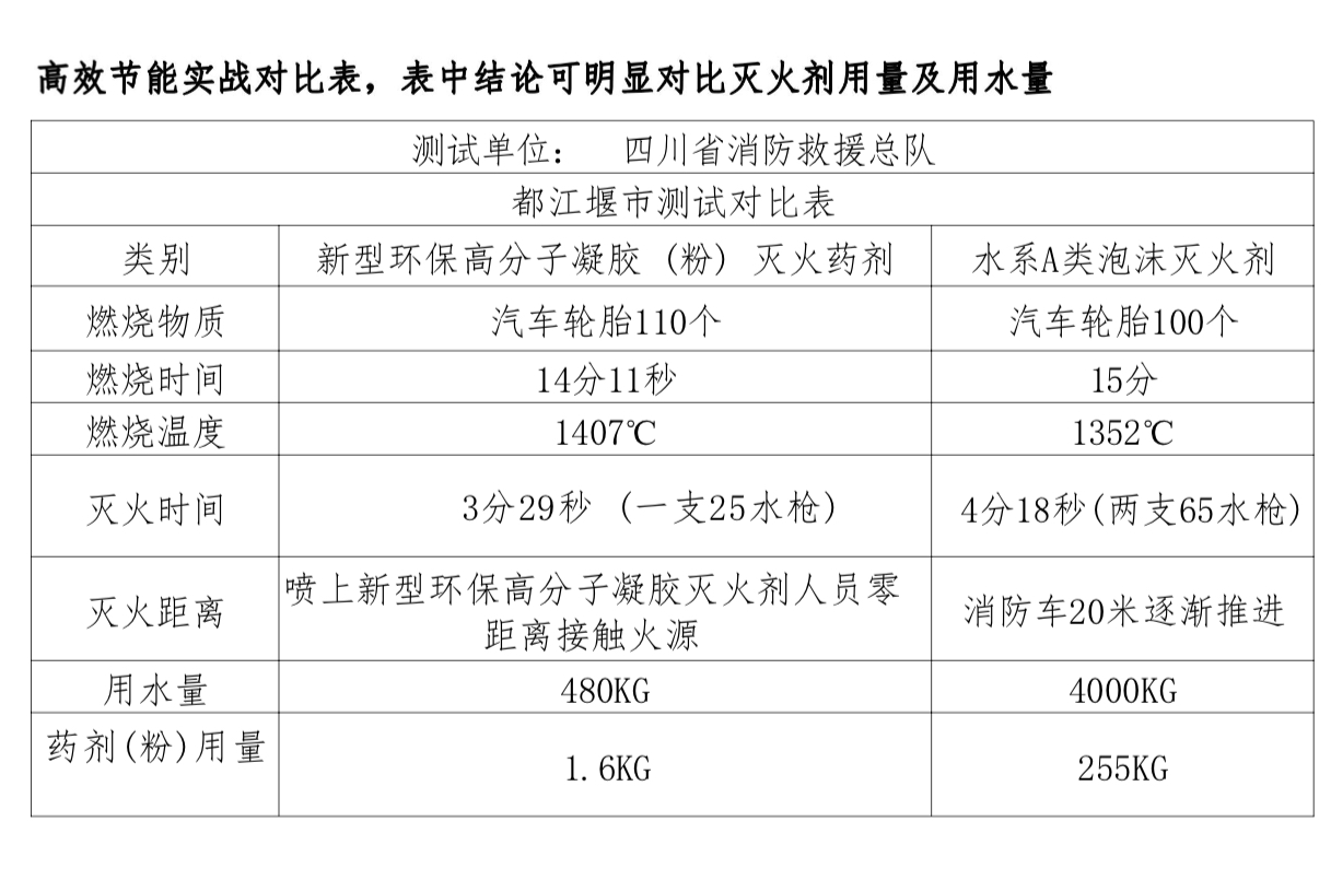 高效节能实战对比表,表中结论可明显对比灭火剂用量及用水量
